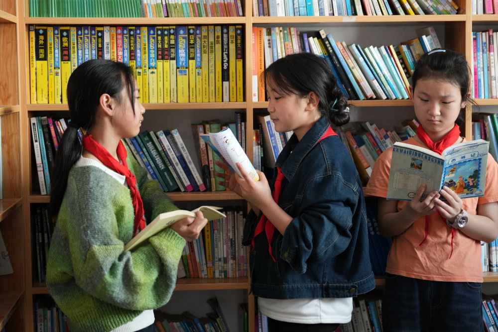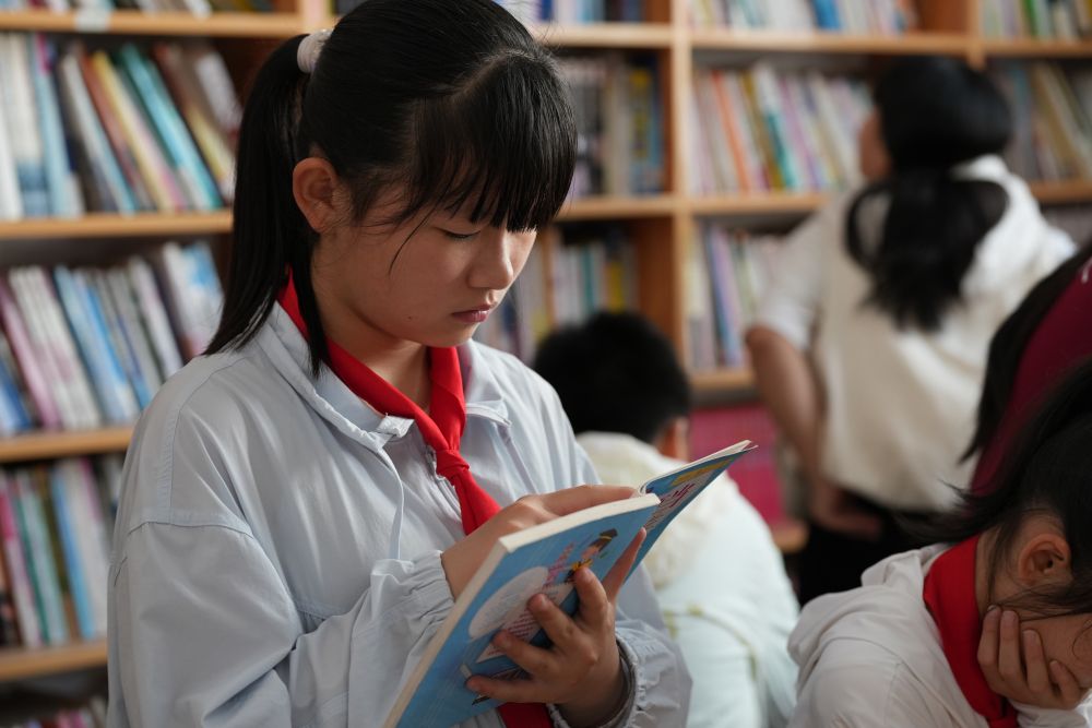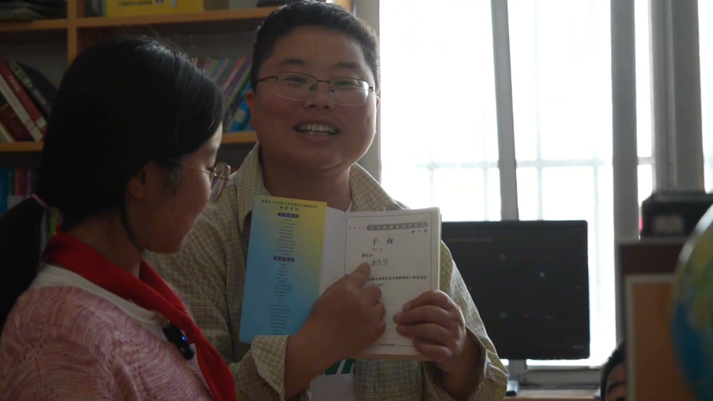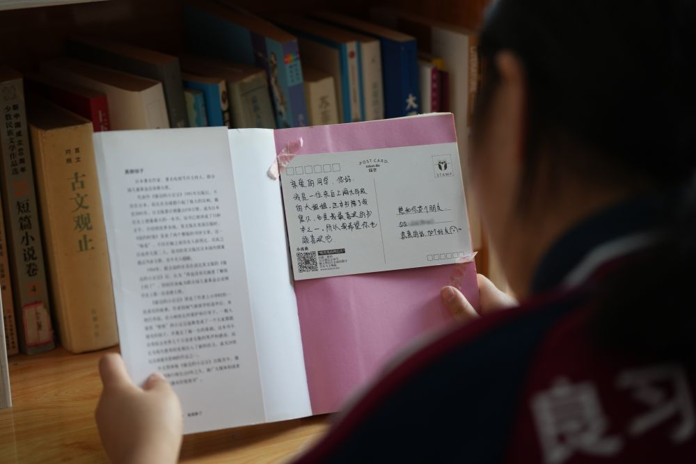 黄草小学副校长戚娇蕊说,学校每个星期都会开展一次借书活动,孩子们在走廊上、教室里读书的身影随处可见。“这个书的扉页上,翻到这个寄语的时候,哇!他们很兴奋。我们的情感也可以用这种方式来进行传递。很多很多的书,给了我们无限的力量,让我们的孩子们过得非常幸福。”