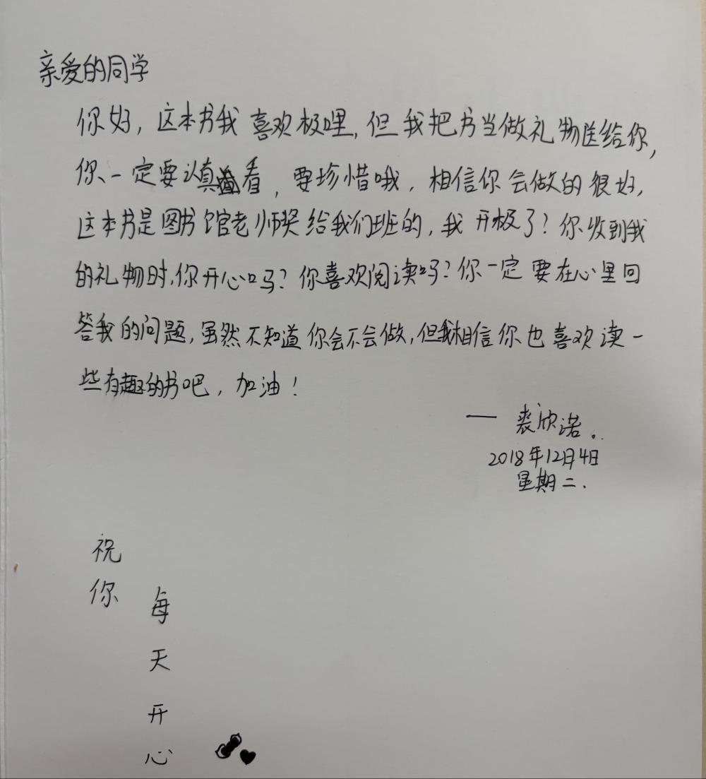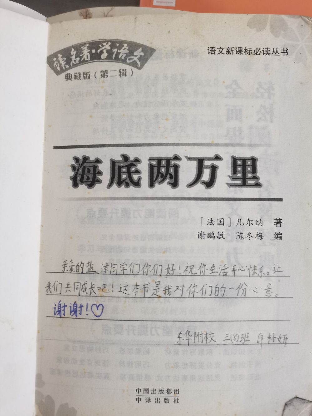 “亲爱的同学,你好!我是一位来自上海九年级的大姐姐。这本书陪了我很久,也是我最喜欢的书本之一,所以我希望你也能喜欢它。”